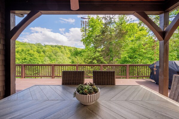 Welcome to your private lakefront retreat, nestled in lush greenery with direct dock access for boating or swimming. Enjoy serene views from multiple balconies and patios, or unwind indoors with warm wood accents, vaulted ceilings, and cozy lounge spaces. Whether relaxing in the game room, exploring the scenic surroundings, or dining al fresco, this spacious home offers comfort, charm, and natural beauty at every turn. Ideal for families or groups seeking both adventure and peace