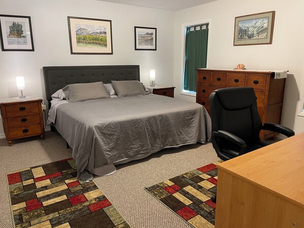 Es gibt drei Schlafzimmer im Haus. Das Hauptschlafzimmer verfügt über ein Queen-Size-Bett aus dunklem Holz und ein eigenes Badezimmer mit zwei Waschbecken. Es gibt ein zweites Schlafzimmer mit einem Kingsize-Bett und schließlich ein Zweibettzimmer über einem Etagenbett im dritten Schlafzimmer. Bei Bedarf gibt es eine Königin Matratze und eine Packung und spielen für die Kleinsten. Für die Abenteurer gibt es sogar einen Futon auf der Veranda. Saubere frische Luft sorgt für einen fantastischen Schlaf, aber hüte dich vor umherziehenden Bären.