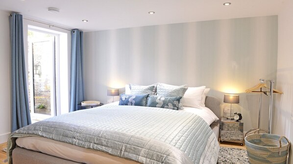 Das Schlafzimmer verfügt über ein Kingsize-Bett, das auf Ihren eigenen Innenhof führt (ein seltenes Stück privaten Außenbereichs für eine so zentrale Lage). Das separate Bad ist mit einer ebenerdigen Dusche ausgestattet.
