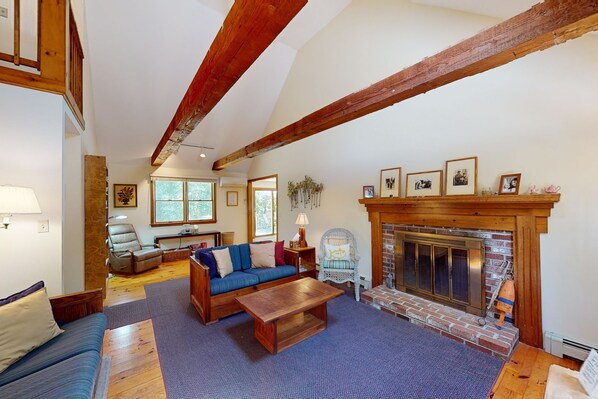Step inside this open and airy Cape home and you'll find the main floor features a spacious open floor plan with cathedral ceilings and beams, encompassing the living room, kitchen, and dining area with sliders leading to a 12 x 20 outside deck. With new split-system air conditioning in the main area, two bedrooms on the first floor, and a master bedroom on the second floor, each equipped with their own a/c units, this home ensures a comfortable stay for all guests.