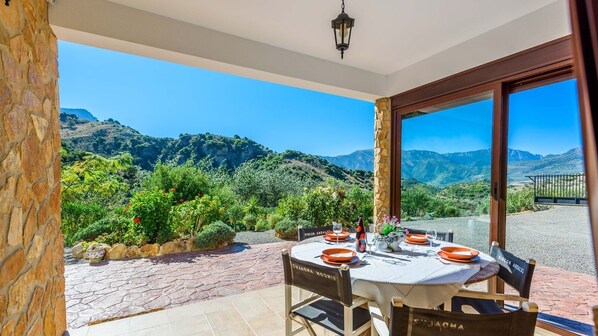 Im Freien, eine herrliche, teilweise verglaste Veranda verfügt über einen 6-Plätze Esstisch, mit dem Sie das Beste aus beiden Welten bekommen: vollen Bauch und atemberaubende Ausblicke. Der Rest der geräumigen Terrasse, die sich im Hinterhof entwickelt, begrüßt einen weiteren Essbereich mit Sonnenschirm und einem schattigen Chill-out-Bereich, wo Sie sich zurücklehnen und die frische Brise genießen können, die von den Bergen kommt. Ein Steinkohlegrill und ein Gasgrill stehen für schmackhafte Mittag- und / oder Abendessen bereit. Rund um den herrlichen privaten Pool, mehrere Sonnenliegen können Sie in völliger Ruhe sonnen, umgeben von üppiger Vegetation, Kakteen und Felsen, die typisch für diese Gegend von Andalusien sind. Last but not least, der kokette kleine Tisch ist ideal, um mit Ihrem Partner einen Drink zu genießen, während Sie die Aussicht genießen.