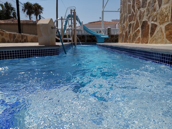 Eine schöne neue Gemeinschafts-Salzwasserpoolanlage mit Whirlpoolbereich, Wasserfontäne, Kinderrutsche, Außendusche und Behindertenlifter finden Sie auch.