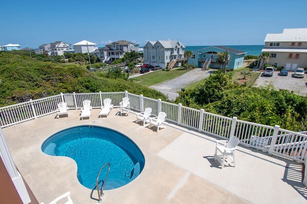 Beached is an impressive 6-bedroom, 6.5-bathroom, almost oceanfront home, with plenty of room and a variety of amenities to entertain your whole party comfortably! Relax by the pool (maybe even have it heated upon request for $650/week + tax) or head out to the ocean for a day of soaking up the sun. The multiple covered decks make it easy to enjoy the salty air and ocean views. With the convenience of a beach access located less than a hundred feet from the house, you will easily find yourself heading out for a dusk or dawn stroll along the sand.