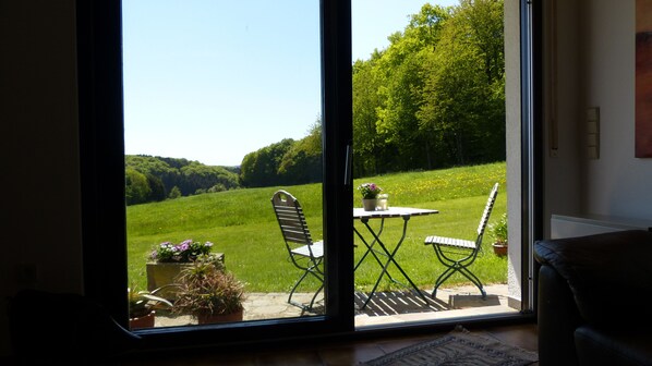 Die Wohnung befindet sich in ruhiger Lage in einem Dorf am Waldrand und einer angrenzenden Wiese, die auch bewirtschaftet wird.