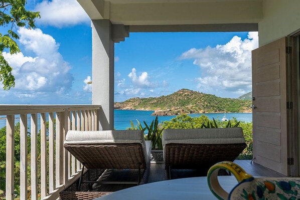 Panoramic glass doors and windows allow the spectacular view of the beach, the harbor entrance to the Nelson’s Dockyard and Fort Berkeley. No tippy toes to peak out a corner window here. Full on eye candy gorgeous views such as the the beach, the harbour & Montserrat.
