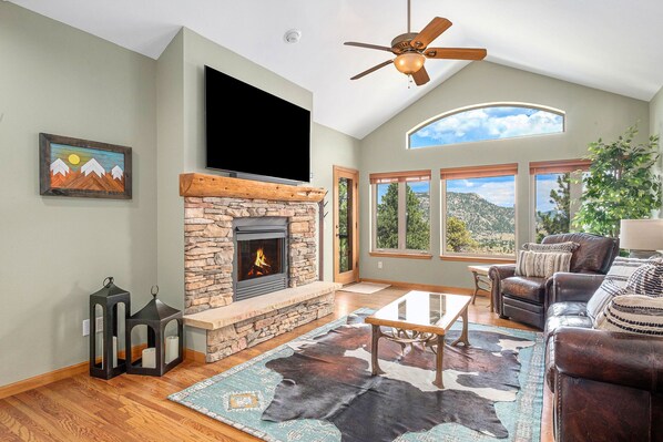 ✹ Living room 1: Upper level, open-concept vintage-style couches, 75” HDTV w/ streaming platforms, gas fireplace, access to wraparound deck + amazing views