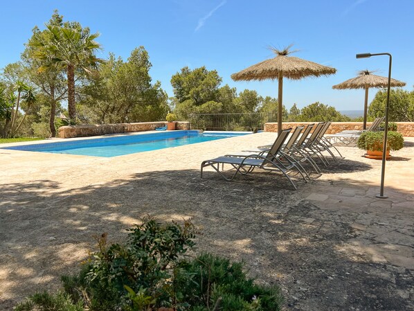 Es gibt keinen besseren Platz um Ruhe und Frieden zu geniessen, als hier. Das Grundstück ist komplett umgeben von Pinien. Lediglich Vogelgezwitscher und ein Hauch von Wind sind zu hören. Es gibt eine grosse überdachte Terrasse mit Blick über den Pool. Hier finden Sie einen Tisch und Stühle für Mahlzeiten unter freiem Himmel, ein mobiler Grill ist ebenfalls vorhanden. Von der Terasse führen einige Stufen zum grossen Pool (12 m x 6 m, Tiefe 1 m – 1.50 m. – 2.60 m) mit gemauerten Stufen. Die grosse Sonnenterasse mit komfortablen Sonnenliegen lädt zum entspannen und geniessen der langen Sommertage ein. Hier bietet sich ein herrlicher Panoramablick.