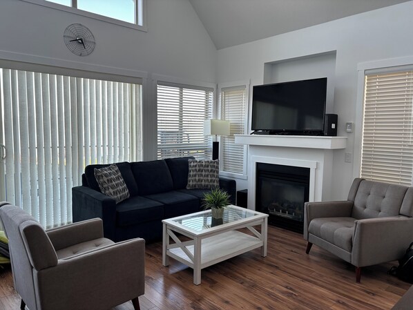 Entry (2 steps up) features an open kitchen, living, dining area with sofa bed, 2 queen bedrooms, and full bath.