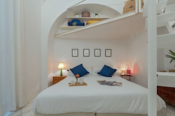The apartment is made of an entrance, a living-room, a main room with double-bed and a mezzanine for wardrobes so to enhance livable space, a bathroom with shower and a fully equipped kitchenette. Another mezzanine above the living-room make space for two single beds and an office.