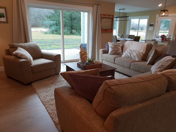 Haben Sie einen Grill auf der hinteren Veranda, es ist so einfach sich zu entspannen, auf einer der hinteren Veranden zu sitzen (einer ist überdacht, einer ist für sonnige Tage) und nichts als die üppige grüne Natur zu betrachten. Braten Sie s'mores an der Feuerstelle im Hinterhof (Brennholz wird gestellt), entspannen Sie sich bei einem Glas Wein um die Gas-Feuerstelle auf der hinteren Veranda oder trinken Sie ein Bier, während Sie auf der neuen Xbox spielen. Nach einer anstrengenden Wanderung oder einem Tag am Strand werden wir im April einen Whirlpool hinzufügen.