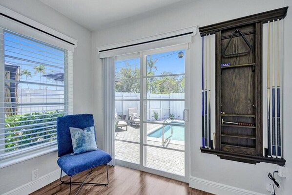 LIVING ROOM 2 - Large L shaped sofa couch to offer a beautiful view while relaxing and watching some of your favorite TV shows & movies on our large sized flat screen T.V. Electric fireplace included! Seating chairs & Pull Out Sofa Bed included! POOL TABLE & AIR HOCKEY INCLUDED! Direct access to pool deck as well! Views of front Tropical Landscape!