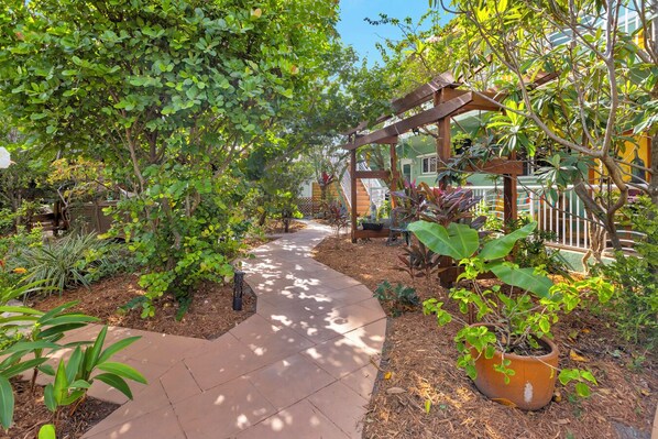 The outdoor space is what sucked me in, it feels like a secluded garden - I was out there a lot! My teens and I stayed for 5 days and it was perfect. The apartment is clean, cute, comfortable and well furnished. I appreciated the snacks and drinks stocked in the fridge - so nice when just getting into town. The beach is an easy walk, lovely and not crowded. The ability to take the bikes to the Broadwalk is such a great amenity. Brian and Aleyda were available and gracious. I couldn't have asked for a better place to stay. I hope to come back!