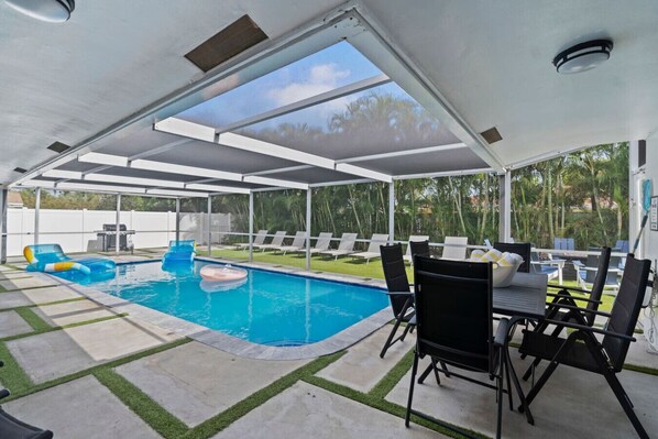 Escape to this beautifully appointed 4-bedroom, 2-bath home designed for comfort, relaxation, and fun in the heart of South Florida. The master suite features a luxurious king bed, while the other three bedrooms each offer cozy queen beds—perfect for families or groups. Step outside to your private backyard oasis featuring a large pool, covered patio, BBQ grill, outdoor dining table, outdoor shower, and plenty of lounge chairs. Unwind in the hammock or enjoy a meal al fresco under the palms.