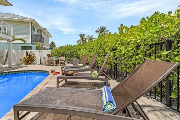 Heated Saltwater Pool: Dive into bliss with the sparkling heated pool, surrounded by a beautiful paved patio. The perfect spot to lounge under the sun or cool off after a fun day at the beach.