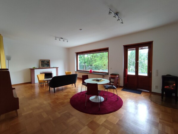 Die für bis zu drei Erwachsene gut geeignete Wohnung liegt zwischen Frankfurt und Darmstadt. Die idyllische Villa aus den 1950er Jahren, die liebevoll im Stil der Zeit saniert wurde. Die Wohnung ist zum Teil mit Originalmöbeln der Zeit ausgestattet. Das großzügige Wohnzimmer (40 qm) verfügt über einen Kamin für romantische Abende zu zweit. Durch einen zeittypischen Torbogen schließt sich ein Essplatz von 20 qm an. Die alten Holzfenster verleihen den Räumen Charme. Ein Buntglasfenster im Eingangsbereich lässt das Lebensgefühl der 50er-Jahre aufleben. Die großzügige, etwas erhöht liegende Terasse lädt zum Sundowner unter den alten Bäumen ein.