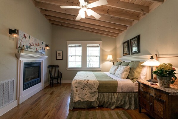 Ein Kingsize-Bett befindet sich im romantischen Schlafzimmer, das platziert wird, um den doppelseitigen Gas-Kamin zu genießen. Freuen Sie sich auf die große Badewanne, die in der Ecke des Schlafzimmers gefunden wurde, um die Köstlichkeiten am Kamin zu erkunden. Ein angrenzendes Bad hat eine große Glasdusche.