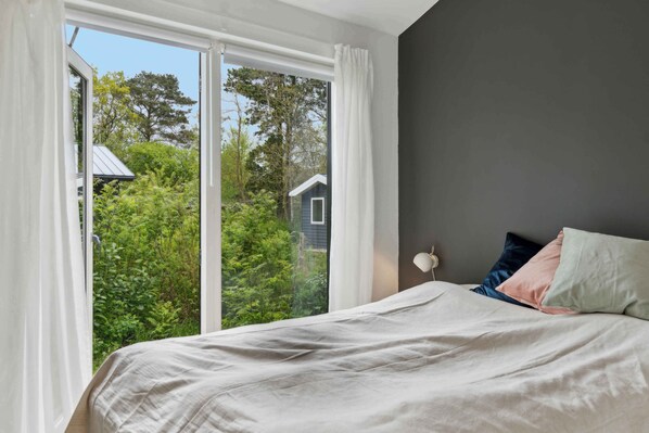 Das Haus verfügt außerdem über zwei Schlafzimmer. Eines mit einem Doppelbett und viel Stauraum, das andere mit einem ausziehbaren Bett mit bequemen Matratzen, das entweder so genutzt oder in ein weiteres Doppelbett umgewandelt werden kann. Wenn Sie Übernachtungsgäste haben, gibt es zwei zusätzliche Schlafplätze auf dem Sofa im Wohnzimmer. Das Haus ist mit Decken, Kissen und viel Geschirr für sechs Personen ausgestattet. Das Haus zeichnet sich durch große Fenster, Dachfenster und einen eigenen Ausgang zum Garten in jedem Raum aus.