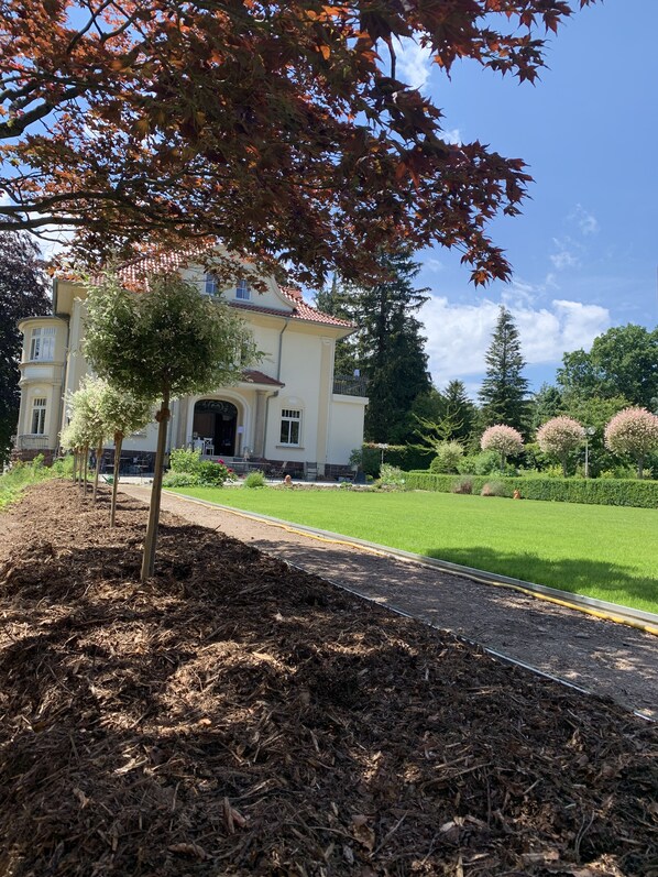 Auf der Terrasse, im Rosenpavillon, im Obstgarten oder im Park finden Sie jederzeit ein gemütliches Plätzchen um zu entspannen. Auch Sonnenliegen und ein Grillplatz stehen Ihnen zur Vefügung.