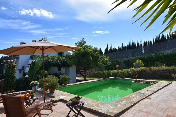 Fernando und Angela, die Besitzer dieses lieblichen Landhauses, wollten ihrem neuen Heim die Atmosphäre eines andalusischen Bauernhauses verschaffen. Statt den Neubau in einer möglichst einfachen Weise auszuführen, entschlossen sie sich unter anderem, die unregelmäßige Form der Mauern eines alten Bauernhauses nachzuahmen, versahen es mit Balkendecken und umgaben es mit einer Terrasse aus Kieselsteinen. Der Pool (8m x 4 m; 1.2 – 1.9 meter diep) ist in eine Struktur aus Naturstein eingelassen und ein weiteres Beispiel für die Bestrebungen der Besitzer, dem Ganzen einen besonderen Charme zu verleihen. Die daneben liegende Sonnenterrasse verfügt über zwei Sonnenliegen und hat einen wunderbaren Ausblick auf die umliegenden Berge und das Dorf Frigiliana in Richtung Mittelmeer. Auf der Ost- wie auf der Westseite finden Sie Terrassen, die Sonne ebenso wie Schatten spenden und inmitten eines Gartens mit Rasen, vielen Blumen, Pflanzen und Bäumen liegen. Alles Notwendige für ein romantisches Abendessen ist vorhanden.