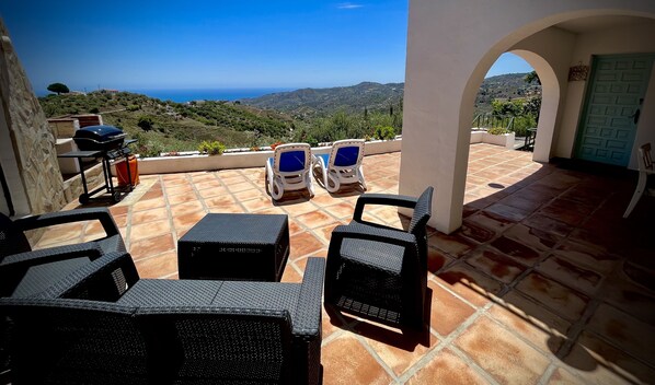 Eine seltene Gelegenheit, ein vollständig nach Süden ausgerichtetes Anwesen dieser Qualität zu mieten, das in diesem Gebiet von Frigiliana lizenziert ist. mit Blick auf die Berge und das Meer. In diesem makellos restaurierten spanischen Apartment im traditionellen Stil finden Sie die richtige Balance zwischen traditionellem Stil und modernem Komfort. Ausgestattet mit einer gut ausgestatteten Küche, einer brandneuen Klimaanlage, 2 Schlafzimmern, 1 Bad und 1 Bad nebenan, einem großen Wohnzimmer, WIFI, um mit der Welt in Kontakt zu bleiben, wenn Sie möchten, und einer wunderschönen Terrasse mit Meerblick privates Schwimmbad. Diese 2-Zimmer-Wohnung befindet sich im unteren Teil eines 1995 im traditionellen ländlichen Stil erbauten Landhauses. Es liegt in einer wunderschönen Landschaft auf einem eigenen Grundstück und ist von Olivenhainen und Avocadobäumen umgeben. Dieses Apartment bietet das Beste aus dem spanischen Klima und den Annehmlichkeiten. Die Kulisse der Wohnung sind die Berge des Parque Naturel Sierra Tejedas, Almijara y Alhama und der atemberaubende Blick nach vorne auf die umliegende Landschaft und hinunter zum Meer. Die Unterkunft befindet sich 70 m von der asphaltierten Straße entfernt und ist sowohl für Taxis als auch für Autos zugänglich. Es gibt Parkplätze für 2 Autos. Die überdachte Terrasse lädt zum Essen im Freien ein und führt zu einer großen offenen Terrasse mit Grill. Durch ein Tor ist der private Pool. Alle diese Bereiche sind für die alleinige Nutzung der Wohnung. Das nächstgelegene Country-Bar-Restaurant ist El Cerro und liegt etwa 10 Gehminuten entfernt. Das weiße Dorf Frigiliana, das als das schönste Andalusiens gilt, liegt 2 km entfernt und ist daher zu Fuß entweder entlang der Straße oder auf der Straße zu erreichen. In Frigiliana gibt es viele Restaurants und Geschäfte sowie Banken. Ein lokaler Bus bringt Sie von dort in die Küstenstadt Nerja, die etwa 8 km entfernt liegt. Nerja ist ein Fischerort, der seinen ursprünglichen Charme behält, obwohl er sich im Laufe der Jahre sympathisch entwickelt hat. Nerja hat viele Restaurants, Geschäfte und Supermärkte (einer ist auf dem Weg von Frigiliana dorthin) und ist berühmt für seinen Balcon de Europa, der ins Meer ragt, seine Höhlen und seine verschiedenen Strände. Die Sierra de Tejeda, der Naturpark Almijara y Alhama, der die Rückseite des Apartments begrenzt, ist für seine Wanderwege bekannt. In Frigiliana und Nerja finden Sie Unternehmen, die sich für Wanderer, Reiter, ATV-Fahrer und andere Abenteuer eignen. Das Apartment ist auch ein idealer Ausgangspunkt, um andere Gegenden Andalusiens zu erkunden. Es liegt weniger als eine Stunde von Malaga, 1 Stunde von Granada, 2 1/2 Stunden von Cordoba, 2 3/4 Stunden von Sevilla und 1 1/2 Stunden von Sevilla entfernt die Alpujarras.