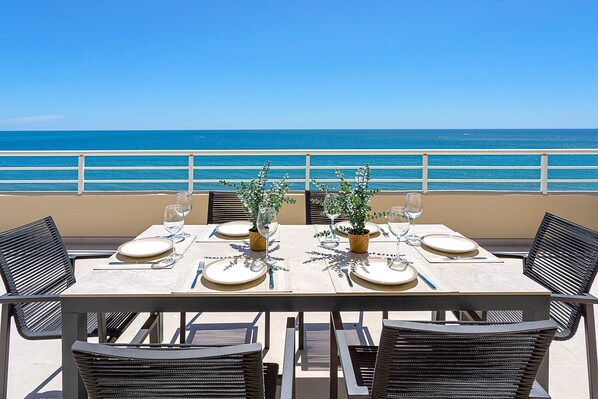 Spectacular newly renovated penthouse with stunning sea views. Located on the front line of Fuengirola’s promenade, this elegant apartment features 3 bedrooms, 2 bathrooms, and a spacious private terrace that surrounds the entire property.