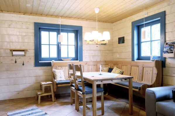 Das Blockhaus verfügt über ein Wohnzimmer mit Kamin/gemütlicher Sitzecke/Fußbodenheizung, moderne Küche, 2 getrennte Schlafzimmer für bis zu 4 Personen, großzügiges Bad mit Dusche/WC/Fußbodenheizung. Waschmaschine und Trockner befinden sich im separaten Servicehaus gegen Gebühr. Im Außenbereich gibt es eine holzbefeuerte Sauna gegen Gebühr.