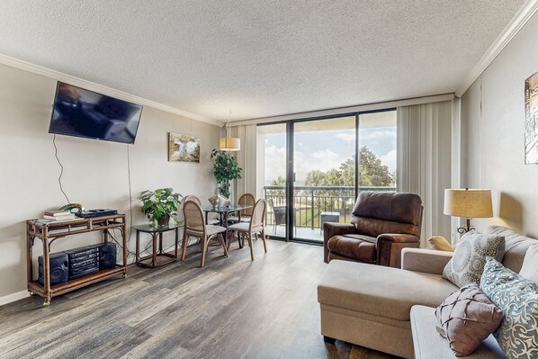 Der Hauptwohnbereich empfängt Sie mit einem offenen Grundriss und viel Licht durch die Glasschiebetüren. Legen Sie Ihre Füße hoch und lehnen Sie sich auf der bequemen Couch zurück, während Sie durch die Kabelkanäle surfen. Wenn sich die Wäsche ansammelt, haben Sie Zugang zu einer gemeinsamen Waschmaschine / Trockner, um sich um die Wäsche zu kümmern.