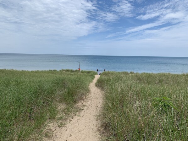 Our stay was fantastic.The house is only a short 3 to 4 minute walk to a wonderful Sandy Beach. There is a sand path to walk in to get to the beach, but we were very happy not to have any stairs.The house is a totally Rehab, renovated older home in a quiet neighborhood. The house has with many modern details, including the kitchen appliances and the fancy bathtub, an open floor plan with lots of sky lights — and soft yet firm mattresses.My favorite part is a very large deck in the backyard among the trees. The deck had plenty of seating with cast-iron chairs, tables, etc. The cushions for the outside chairs were very comfortable. I spent most of my non-beach time on the deck! Host made everything easy and was a great communicator.