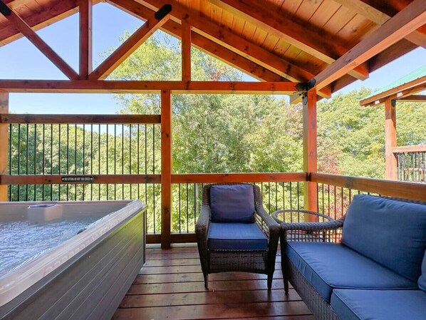 Only 3 steps into the door from the flat, paved driveway (with parking for 2), Love This Life makes it easy to unload and pack the cars. After everyone’s checked out the cabin and settled in, head for the outdoor spaces that boast lovely, wooded views. Enjoy coffee in a rocking chair on deck every morning and a refreshing hot tub soak every evening…or vice versa because it’s YOUR vacation! And enjoy Smoky Mountain cookouts at the cabin with a gas grill and outdoor dining table. There’s also cushioned seating to enjoy chats with friends and the serenity of the Smokies.