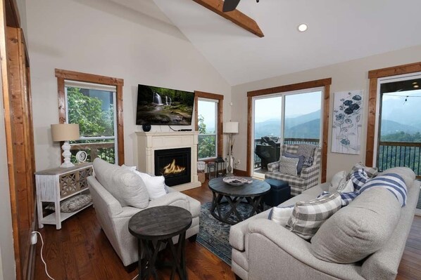 •Two living rooms with flat-screen TVs and cozy fireplaces.