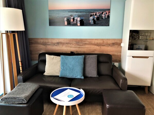Wohnbereich mit Sitzecke inkl. Sat-TV (58) mit Soundbar und Blu-Ray-Player