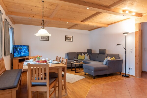 Unsere Ferienwohnung Amselnest ist ca. 70 m² groß und hat einen Balkon auf dem sie die Morgen- und vorallem die Nachmittagssonne genießen können. Die Wohnung verfügt über zwei getrennte Schlafzimmer mit einem Doppelbett und zwei Einzelbetten im Obergeschoss. Außerdem im Obergeschoss befindet sich eine zusätzliche Gästetoilette. Der Wohnraum ist sehr geräumig, so das sich die Küche, die voll ausgestattet ist, gut einfügt. Das Wohnzimmer ist mit einer großzügige Couch und einem Esstisch möbliert und wurde 2025 mit einer neuen Couch, neuen Polstern und Vorhängen modernisiert. Das Badezimmer ist mit einer großen und ebenerdig begehbarer Dusche ausgestattet. Bei der Einrichtung der Wohnung wurden nur hochwertige Materialien wie, Parkettböden, Fliesen und Holzmöbel verwendet.