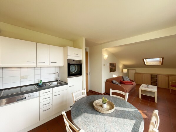 Die geräumige, nach Süd-West ausgerichtete 2-Zimmerwohnung ist etwa 40 qm groß und befindet sich im Dachgeschoss. Das Appartement ist für 2 bis 4 Personen geeignet. Im Wohnbereich finden Sie eine komfortable Schlafcouch (1,60m x 1,95m), einen LED-Fernseher, einen Essplatz für 4 Personen sowie die Küchenzeile. Sie ist mit Cerankochfeld, Spülmaschine, Backofen, Kaffeemaschine, Wasserkocher, Toaster, Kühlschrank mit Eisfach und allen wichtigen Küchenutensilien ausgestattet. An den Wohnbereich grenzt die nach Westen gerichtete, bestuhlte und sonnige Loggia mit Blick auf einen kleinen Park. Das gemütliche Schlafzimmer verfügt über ein Doppelbett (2 x 0,90 x 2,00 m) mit 7-Zonen-Matratzen, einen Kleiderschrank und eine Spiegelkommode. Das Bad ist mit WC, Waschbecken und Föhn ausgestattet. Die geräumige Dusche ist ebenerdig zu begehen und mit Glaswänden abgetrennt. In der kühleren Jahreszeit wärmt die angenehme Fußbodenheizung in allen Räumen den Terracottaboden. Auch im Urlaub brauchen Sie auf einen WLAN-Zugang nicht verzichten. Dieser ist für Sie inklusive vorhanden. Ein eigener Stellplatz Nr. 31 für Ihr Fahrzeug befindet sich hinter dem Haus. In einem separaten Raum können mitgebrachte oder geliehene Fahrräder abgeschlossen werden. Auch 1 Vierbeiner ist gegen eine Gebühr ein gern gesehener Gast. Die Erstausstattung eines Wäschepaketes (komplette Bettwäsche, 1 Duschhandtuch, 1 kleines Handtuch) können Sie bis 14 Tage vor Anreise dazu buchen oder durch eigene ergänzen. Ab 2 gebuchten Paketen erhalten Sie einmalig 1 Geschirrhandtuch und 1 Duschvorleger hinzu.