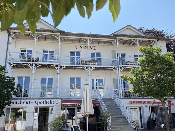 Das Haus Undine ist ein Appartementhaus mit historischer Bäderstilfassade. Es befindet sich im Ortskern von Göhren und bietet einen idealen Ausgangspunkt für Ausflugsziele jeder Art. Von hier aus sind es nur drei Gehminuten über die Flaniermeile bis zum feinen Sandstrand. Eine Apotheke und eine allgemeinmedizinische Arztpraxis für Ihr Wohlbefinden befindet sich im Haus. Eine kleine, aber feine Vinothek wartet auf Ihren Besuch. Die gemütlichen Wohnungen sind mit Fußbodenheizung ausgestattet und verfügen über einen eigenen Stellplatz am Haus. Ein Fahrradverleih befindet sich direkt nebenan.