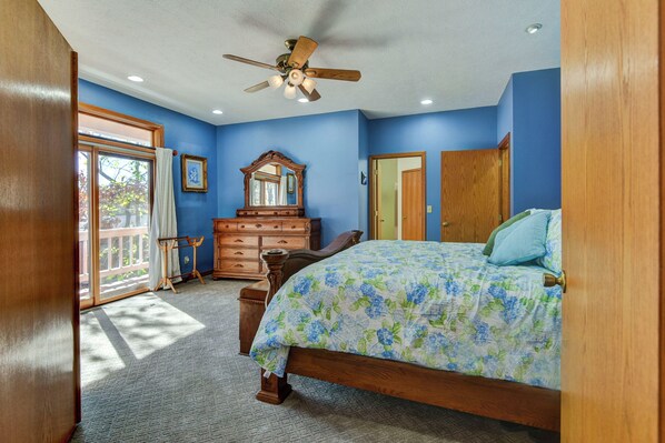 The Master bedroom features a wonderfully comfortable King bed. It features calming baby blues and forest greens and will provide a wonderful place for you to rest. The ensuite bath features dual sinks, shower and a jacuzzi tub big enough for 2 persons.