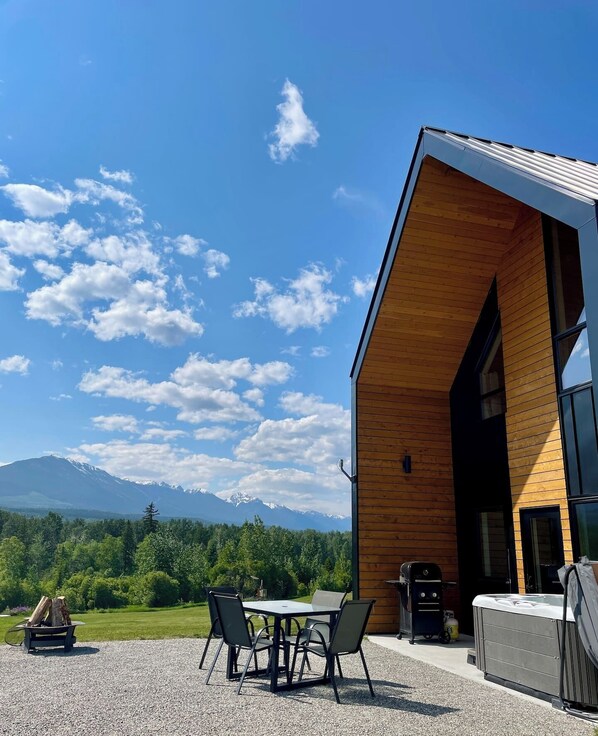 - Large windows that provide panoramic views - A deck with a BBQ grill - A hot tub - A fire pit - An outdoor dining area