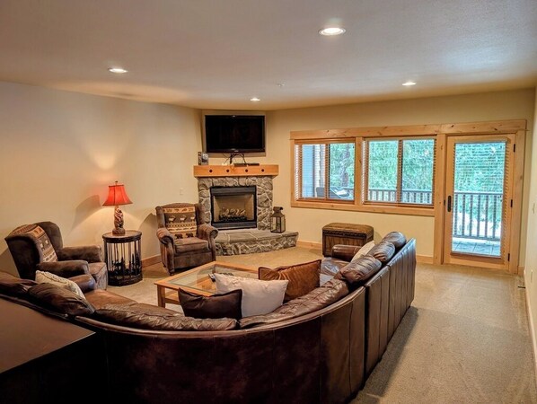 Living Room: Relax on the expansive wrap-around leather couch in front of the impressive stone gas fireplace.