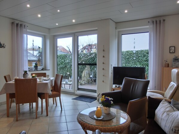 - eine Sitzecke mit Sofa, Tisch und zwei Sesseln, einem separaten Ruhesessel, Fernseher und CD-Radio, DVD Blue Ray Player und einem Esstisch mit vier Stühlen.