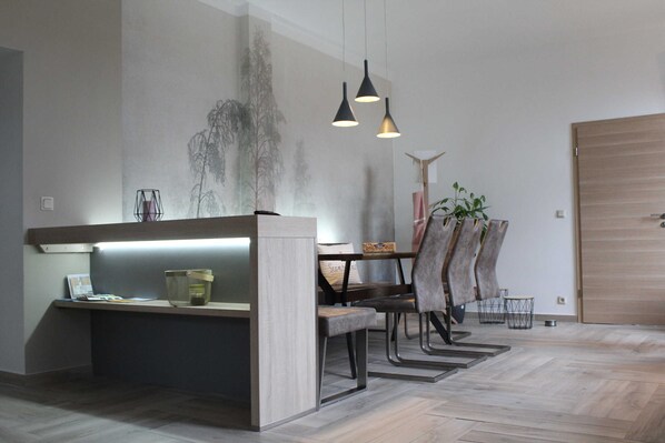 Die geräumige Erdgeschosswohnung - größtenteils mit Fußbodenheizung und hochwertigen Fliesen ausgestattet - wurde 2020 komplett modernisiert. Vom Herzstück der Ferienwohnung, der großzügigen Wohnküche mit Flat-TV gelangen Sie in die drei stilvoll eingerichteten Schlafzimmer, jeweils mit Doppelbett und einer Schlafcouch ausgestattet. In jedem der Schlafräume besteht daher die Möglichkeit zur Aufbettung für eine Person. Von den drei Schlafräumen sind zwei durch eine Durchgangstür verbunden. Bei Nutzung aller Schlafräume ist daher einer ein Durchgangszimmer.