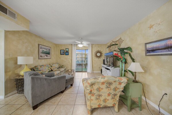 Your perfect beach vacation awaits at Sundial A2! Step into this inviting retreat, where comfort and relaxation await. The cozy living space welcomes you with a plush sleeper sofa and a large flat-screen TV, perfect for unwinding after a day of adventure. Step out onto the private balcony and let the gentle Gulf breeze wash over you as you savor your morning coffee, surrounded by the soothing sounds of the waves. The open-concept layout of the living space offers ample room to gather and socialize, with a dining table comfortably seating four and additional seating for three at the kitchen bar. The well-equipped kitchen awaits your culinary creations, stocked with pots, pans, and utensils, and boasting the added convenience of an under-counter ice maker. Plus, a washer and dryer are conveniently tucked away for your use. Retreat to the delightful main bedroom, where a sumptuous king-size bed awaits alongside another flat-screen TV, with access to the private balcony for added tranquility. The main bathroom offers a luxurious shower/tub combo for your comfort. In the second bedroom, you'll find a king-size bed, while the second bathroom features a convenient walk-in shower. With all these comforts and more, your stay in this inviting haven is sure to be a memorable one.