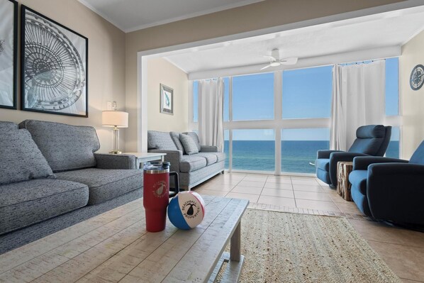 Living Room – Two queen-size sleeper sofas, large HDTV, and floor-to-ceiling windows offering stunning beachfront views.