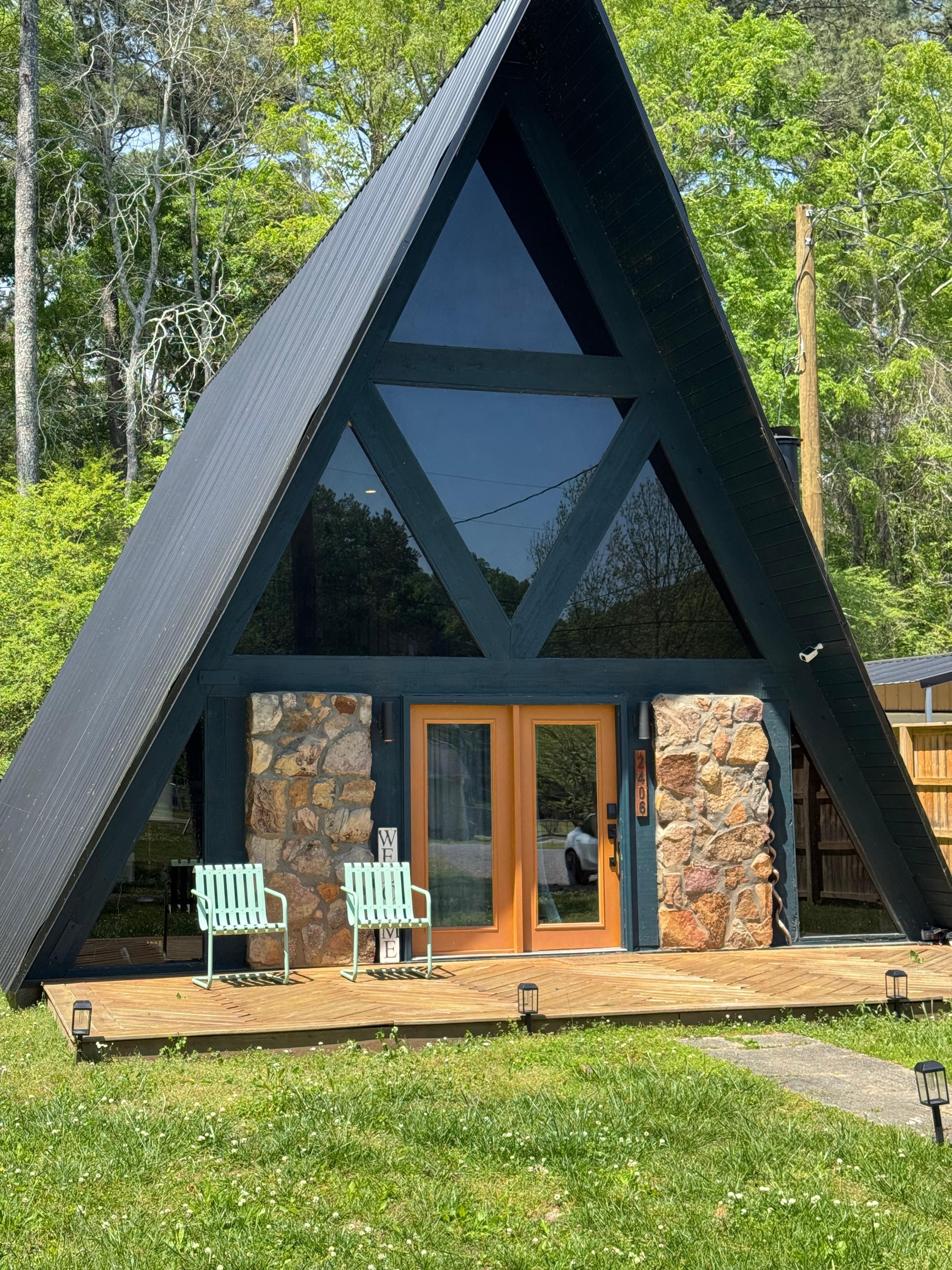 Nestled beneath the trees in peaceful Guntersville, Alabama, Cushy Lake Frame is a retro-modern A-frame built in 1977 and lovingly restored with luxurious jewel tones, vintage charm, and all the comforts of home. It's the perfect summer escape for families, friend groups, or dog-loving adventurers who want to reconnect with nature without giving up modern convenience.