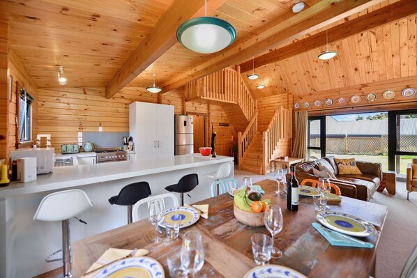 Drenched in sunlight and boasting idyllic mountain views, from start to finish you’ll enjoy ultimate rest and relaxation at this three-bedroom accommodation. The high vaulted ceilings, cosy and colourful open-plan, kitchen, living and dining space provide a perfect base that the whole family will love.