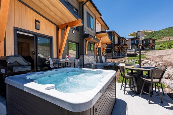 The contemporary design of the living room features luxury furnishings, including a plush leather sofa and accent chairs. A gas fireplace adds a cozy ambiance, while the 65” LG Smart TV with Roku ensures ample entertainment options. Natural light floods the space, which also offers access to a patio equipped with a new hot tub, patio furnishings with a heater, and a gas BBQ.