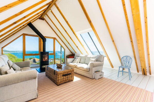 Ein wunderschönes und gut gestaltetes "Upside-Down" -Haus mit Panoramablick auf das Meer.