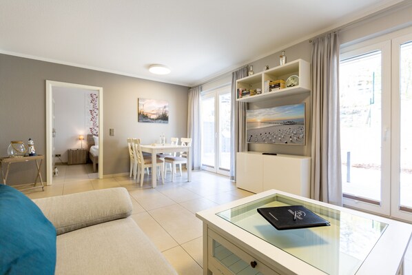 Ein Traum für Sonnenanbeter ist die großzügige Südterrasse mit Strandkorb – dazu ein Appartement, das auf 65 Quadratmetern alle Urlaubswohnträume erfüllt. Dieses wunderschöne Zwei-Raum-Appartement im 1. Stock – erreichbar via Fahrstuhl – ist ein ideales Domizil für zwei Personen. Lichtdurchflutet, geräumig und geschmackvoll eingerichtet, bietet es reichlich Platz zum Aus- und Entspannen. Ein Wohn-Esszimmer mit offener Wohnküche ist tagsüber der Mittelpunkt. Mit seinen beiden maritimen Sofas, den ausgewählten Lampen und Accessoires strahlt es viel Gemütlichkeit aus. Ein Flat-TV bietet Home-Entertainment vom Feinsten. Das WLAN ist kostenfrei. Kalte Füße müssen Sie nicht fürchten, denn die Wohnung verfügt über eine Fußbodenheizung. Die offene Küche ist mit hochwertigen Markengeräten voll ausgestattet. Ein kleiner Frühstückstisch für zwei Personen gehört auch dazu. Oder setzen Sie sich für die Mahlzeiten an den schönen, weißen Esstisch im Wohnzimmer mit Blick auf die Terrasse hinaus. Diese ist von allen Zimmern aus zugängig. So können Sie gleich mit den ersten Schritten des Tages frische Ostseeluft genießen. Das behagliche Schlafzimmer wird denn des Nachts zum erholsamen Wohnungsmittelpunkt. Ein bequemes Doppelbett sorgt für Schlafvergnügen. Ein geräumiger Schrank birgt sämtliche Urlaubsgarderoben. Auch im Schlafzimmer befindet sich ein Flat-TV. Das moderne Badezimmer verfügt über eine schöne, große und ebenerdige Dusche, ein Waschbecken und ein WC. Handtücher liegen dort bereit. Bei Anreise sind die Betten bezogen.