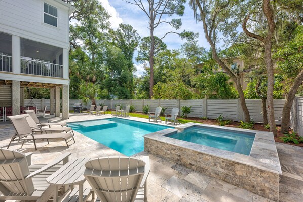 With, East facing pool, there is direct sun throughout the day and just a 2 minute walk to the beach just out the private back gate of the property. There are no condos or resorts in the area so the beach is never overcrowded, virtually a private beach experience with a wide and flat beach with miles of beach in both directions for bike ride and beautiful walks. You are a short bike ride or walk to Coligny Circle with your choice of restaurants, shopping and supplies.