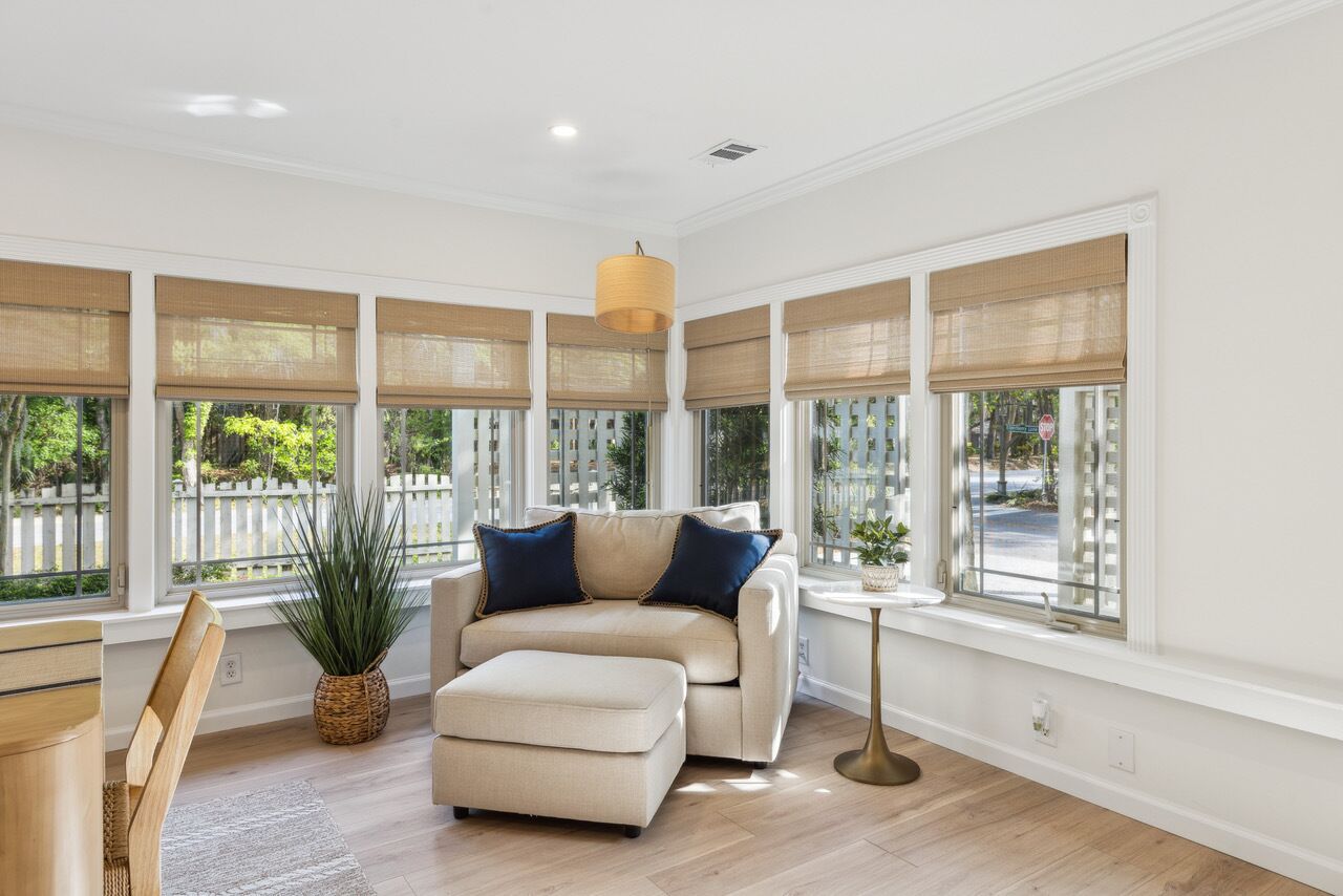 As you enter the home you will immediately notice the hardwood floors that look almost like driftwood in color. The home tastefully decorated in whites, blues and grays making you feel relaxed and like you are at an ocean retreat. To the left of the entrance is a ½ bath then the office which has a blue leather couch and matching chair, desk by the window and 40" SMART TV. The perfect, quiet location to catch up on some work or a homework station for the kids. To the right of the entrance is the living room complete with a white couch and two chairs, a high-top table with three stools and a 60” Samsung TV mounted over the fireplace. There are glass doors that open out to the front porch. The dining room has a table that seats six and a beverage center complete with a sink, wine fridge and ice maker. From here you enter the gourmet kitchen with a large granite topped island with three stools, stainless steel appliances including a Sub Zero refrigerator, a Wolf 6-burner gas stove and a large pantry.