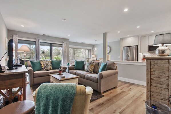 Dieses wunderschön renovierte Stadthaus mit 2 Schlafzimmern und 2 Bädern überblickt den George Fazio Golfplatz, einen der begehrtesten Plätze, um in den Palmetto Dunes zu spielen. Beim Eintritt führen sechs Stufen zum wunderschön eingerichteten offenen Wohnbereich. Der große Esstisch bietet Platz für sechs Personen und öffnet sich in die Küche und das Wohnzimmer mit weitem Blick auf den Golfplatz. Die voll ausgestattete Küche ist ideal für Ihre Urlaubsmahlzeiten, mit Blick auf den Hauptwohnbereich, und bietet Ihnen einen großartigen Raum für alle, um Zeit miteinander zu verbringen! Entspannen Sie sich in diesem hellen und sonnigen Wohnzimmer, das mit einem Schlafsofa, einem Sofa und einem Sessel sowie einem Flachbild-TV und einem Schieberegler auf den Balkon ausgestattet ist.