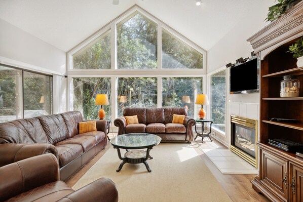 Twelve steps bring you into this Sea Pines home - as you enter the home the kitchen is on the right. The bright and sunny kitchen is outfitted with stainless appliances and an eat-in table for four. The kitchen is fully equipped for all your cooking needs. Off the kitchen is the open living room/dining room area. High ceilings and lots of windows open up this area. The dining table seats six. The spacious living area features a leather sleeper sofa, love seat, chair and wall mounted flat screen TV. Doors from this room lead to the back porch with seating and a gas grill. The home overlooks the Sea Pines Forest Preserve.